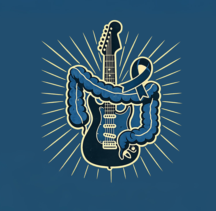 colon cancer screening graphic with blue background and and guitar with a colon wrapped around it