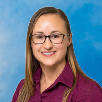 Amber's smiling headshot on blue background with long hair and glasses