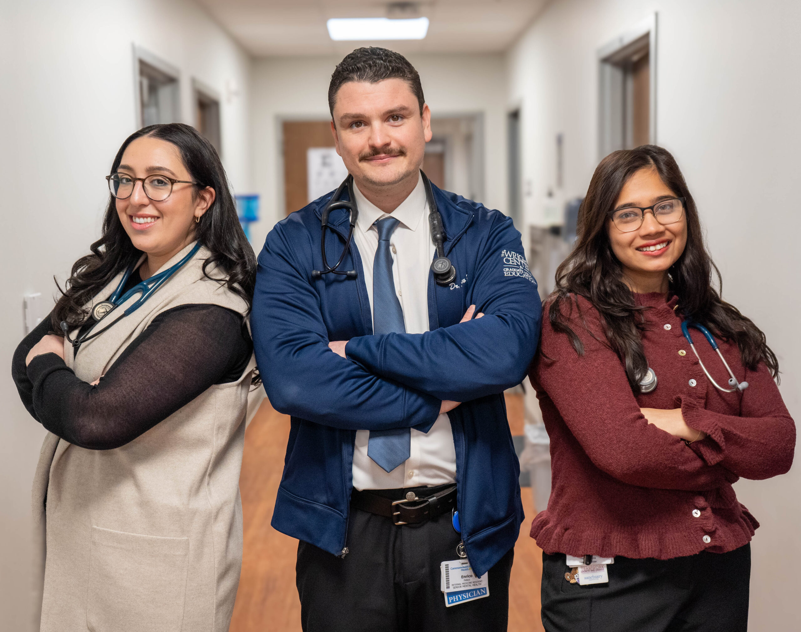 two female and one male resident posing while standing in hallway of health center